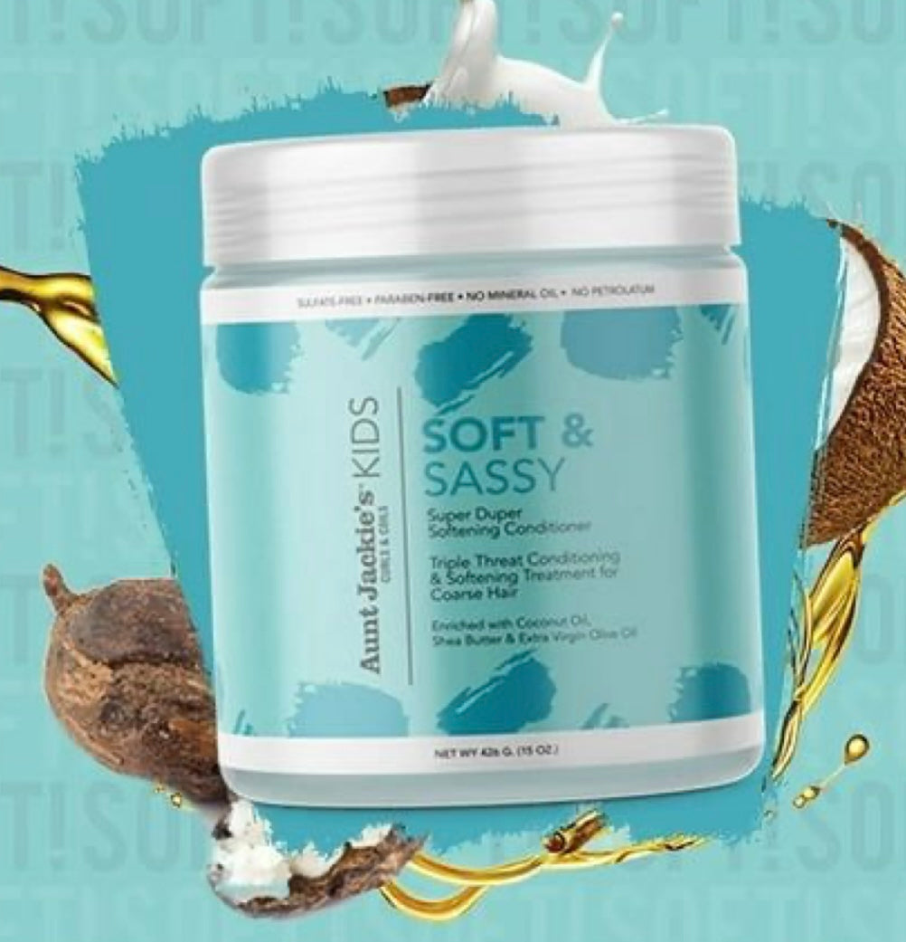 Après-shampoing adoucissant SOFT & SASSY de la marque Aunt Jackie's Girls hydrate et nourris en profondeur les boucles pour un resultat sans frisottis.